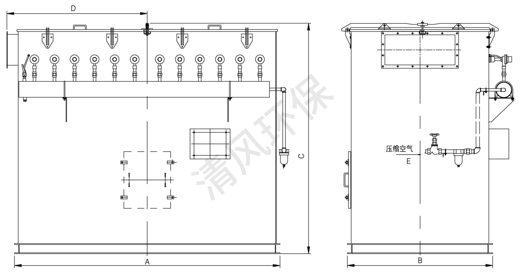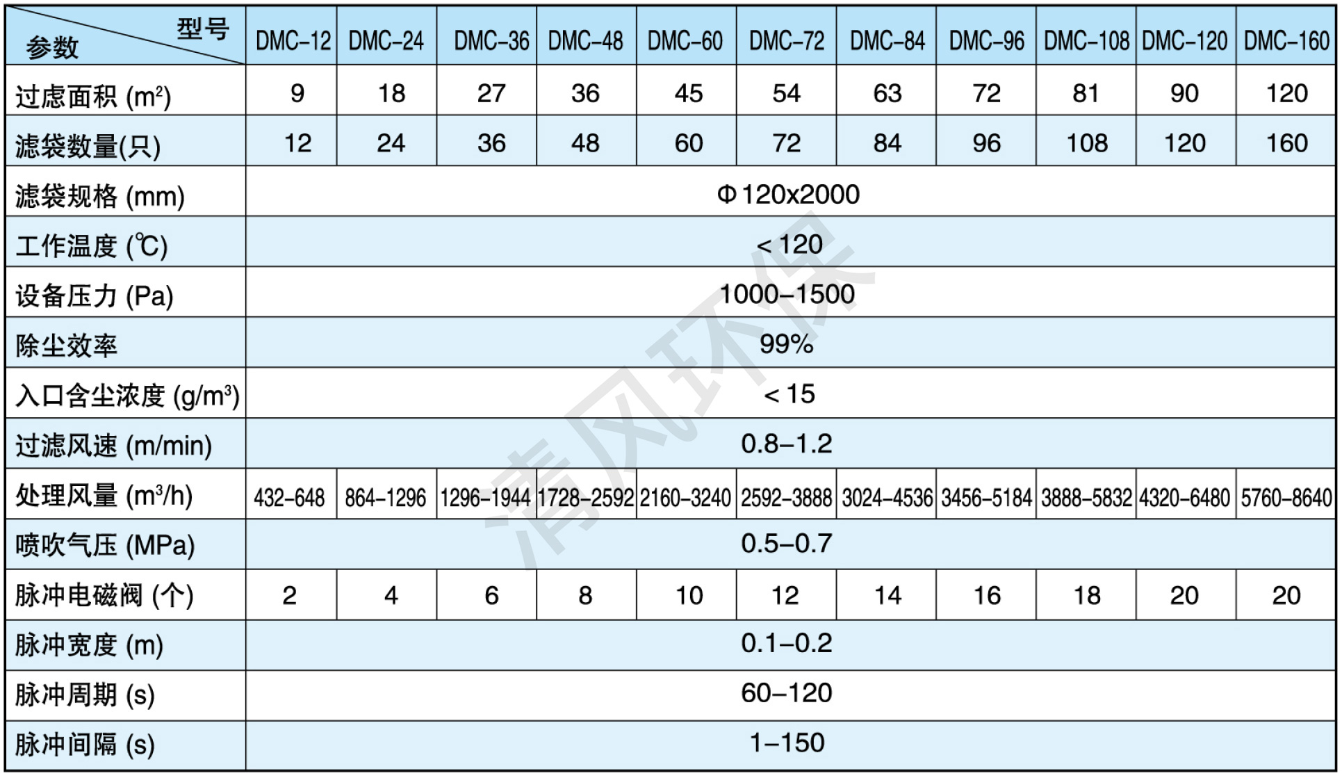 脈沖袋式除塵器主要技術(shù)參數(shù)見(jiàn)下表,在選型時(shí)應(yīng)注意入口粉塵濃度,在技術(shù)性能上,透過(guò)濾袋的氣流速度(即過(guò)濾風(fēng)速)與氣體含塵濃度成反比,因此,在確定過(guò)濾面積時(shí),還必須滿足濾袋的聚塵能力(即兩次清灰期間濾袋單位面積上******允許積塵數(shù)量),一般聚塵能力不大于400g/m2,可按下式計(jì)算:聚塵能力=入口氣體含塵濃度*過(guò)濾風(fēng)速*兩次清灰間隔時(shí)間,計(jì)算結(jié)果如超過(guò)聚塵能力,應(yīng)調(diào)整過(guò)濾風(fēng)速,增加過(guò)濾面積。