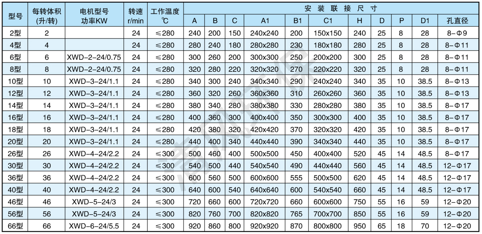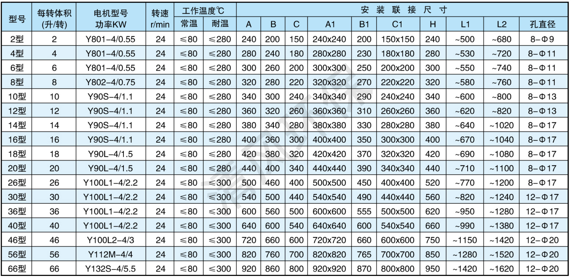 本產(chǎn)品在結(jié)構(gòu)上分A型和B型,A型為直聯(lián)式傳動(dòng),技術(shù)參數(shù)見(jiàn)表一;B型為針輪減速機(jī)配鏈傳動(dòng),其技術(shù)參數(shù)見(jiàn)表二;產(chǎn)品殼體是標(biāo)準(zhǔn)鑄鐵,還可生產(chǎn)鑄不銹鋼、鑄鋁、鑄銅、焊接殼體等,產(chǎn)品配用普通電動(dòng)機(jī)以Y系列為標(biāo)準(zhǔn),還可配用防爆電機(jī)、調(diào)速電機(jī)、變頻器等。最終以客戶要求為準(zhǔn)。
